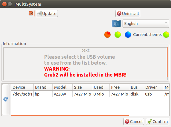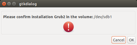 那么,拔出/重新插入USB,再次運行MultiSystem。選擇USB盤,再次點擊確認。現在,你被要求確認在USB中安裝Grub2.點擊OK繼續。