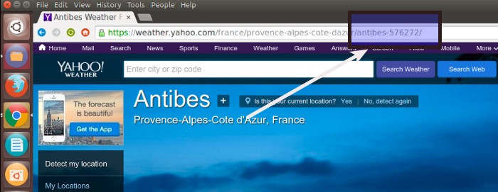 Flair Weather 使用 Yahoo 的天氣服務,但它不能自動地識別你的位置。你需要手動地編輯它。到Yahoo 天氣 網頁,然后通過鍵入你的城市/Pin 碼來得到你所在城市的位置 ID號。你可以從網頁地址欄中取得位置 ID 號。