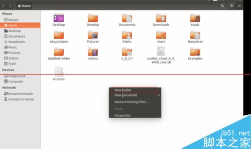 1、本文以Home目錄進行事例講解,所以先進入Home目錄, 鼠標右鍵新建一個文件夾。