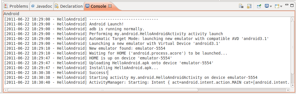 好了,一切都可以了,現在可以Run了,當然Run as成 android application了,Eclipse會自動啟動模擬器,自動安裝apk,自動運行的。