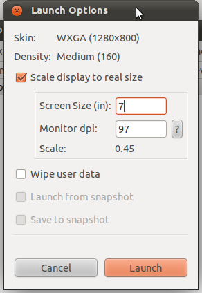 所以,還是建議你修改一下,采用自定義分辨率吧,比如我用的480*300或者640*400效果都可以接受。當然還有一種方法是在模擬器的start...窗口選擇:Scale display to real size也可以,當然默認3英寸太小了,調節成7英寸或者5英寸就效果不錯了,但是這個模式速度比較慢,而且看不太清楚,不推薦。如下圖所示: