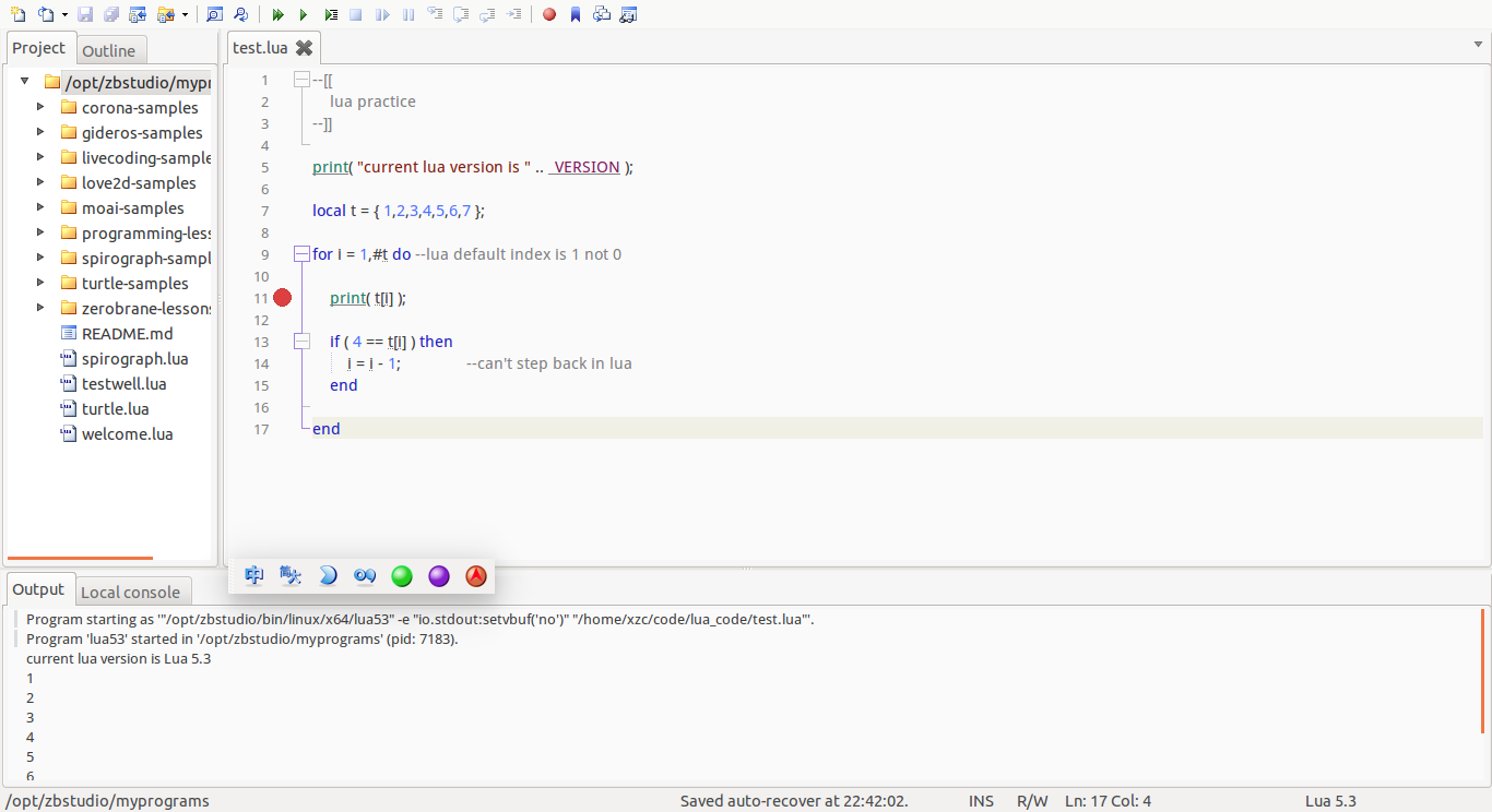 學習新的語言,應該是先編譯、安裝、部署開發調試環境,然后練習...可是,我現在并沒有項目做啊,我只是想先熟悉一下lua的語法,沒必要這么復雜。于是便開始找個簡單的lua IDE。挑來挑去,選了個ZeroBrane Studio,原因是它小巧,可以單步調試。另外,在linux下也不是有那么多的選擇的,我可不想剛開始學就用個sublime text寫個xxx.lua再到shell去執行lua xxx.lua。