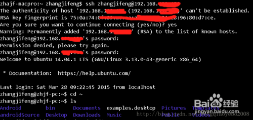 4、在其他電腦上使用ssh連接;最后cd ~和ls 顯示的內容已經是Ubuntu上的內容了,說明已經連接成功。