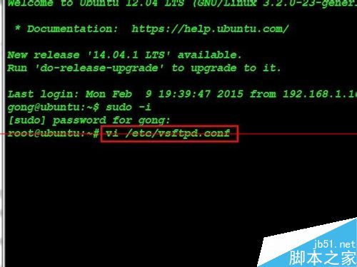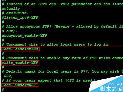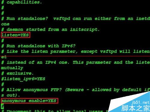 2、接下來是配置FTP,我們利用命令vi /etc/vsftpd.conf,打開配置文件,修改文本并保存。大致修改有五處分別是: