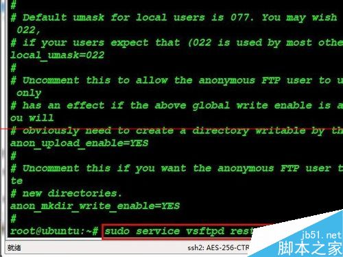 3、配置好后重啟FTP服務(wù)。利用sudo service vsftpd restart命令。