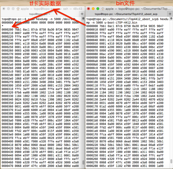 我們需要確定從tf/sd卡的第一個block開始處,確實正確燒寫了u-boot-iTOP-4412.bin這個文件,下面我們對比一下,用到的命令同樣還是hexdump。