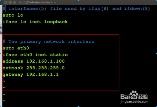 3、添加:# interfaces(5) file used by ifup(8) and ifdown(8)auto loiface lo inet loopback這以下的是為添加上去該文件上的內容:# The primary network interfaceauto eth0iface eth0 inet staticaddress 192.168.1.100netmask 255.255.255.0gateway 192.168.1.1,如圖:
