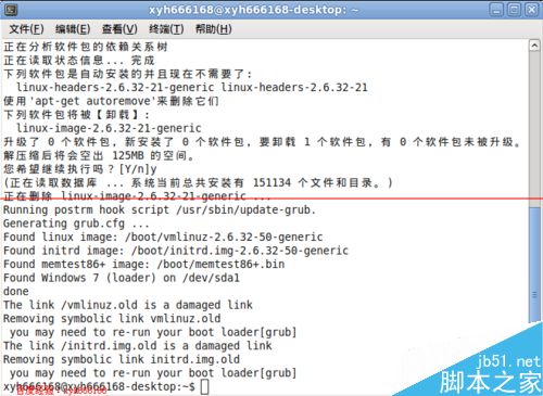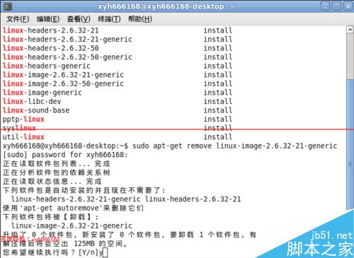 5、執(zhí)行過(guò)程中會(huì)警告我們確實(shí)要執(zhí)行這個(gè)操作,輸入字母y,然后回車,就開始卸載舊內(nèi)核了