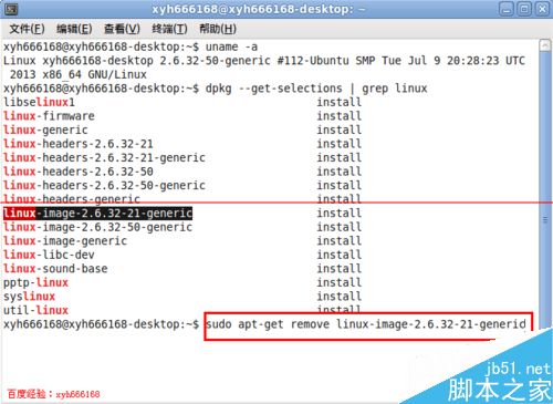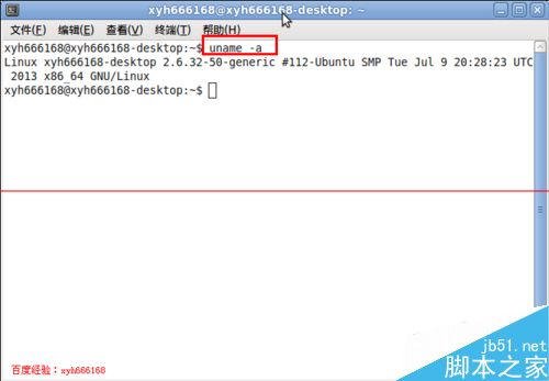 2、在終端命令窗口中輸入并執(zhí)行下面的命令:uname -a,查看我們當(dāng)前使用的內(nèi)核,不要?jiǎng)h除錯(cuò)誤了,或者當(dāng)我們使用的是舊內(nèi)核進(jìn)入系統(tǒng),想刪除這個(gè)內(nèi)核啟動(dòng)項(xiàng),這樣也是不能刪除的。只能在開機(jī)時(shí)選擇別的內(nèi)核啟動(dòng)項(xiàng)進(jìn)入系統(tǒng)才能刪除