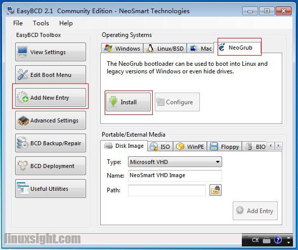 安裝完成后打開EasyBCD,選擇 Add New Entry — NeoGrub — Install