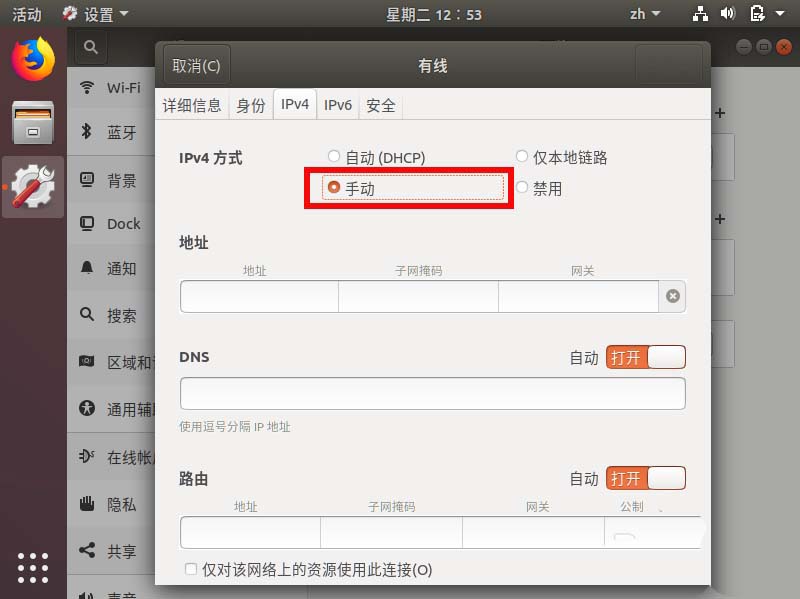 6、接著頂部選擇Ipv4,里面選擇 手動,根據前面的信息填寫進去,然后重新連接網絡就可以固定ip了。