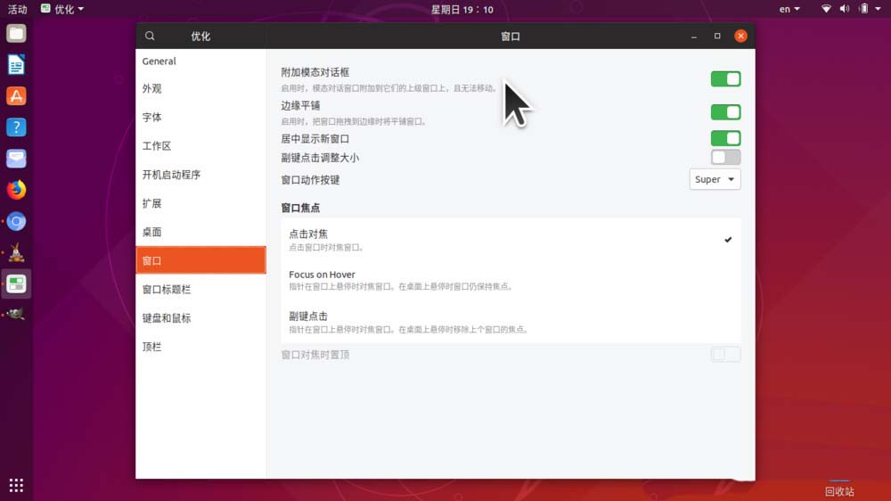 4、在啟動好的 Gnome Tweaks 優化工具軟件窗口中,在左側的導航欄單擊“窗口”分類,右側內容則顯示該分類的內容。