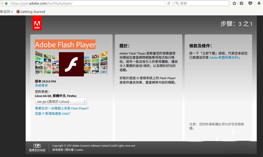 3、播放視頻時firefox提示需要安裝flash插件(在瀏覽器的獲取附加組件和ubuntu應用中心中又找不到),可以在Adobe Flash Player官網下載linux版的安裝文件。如果下載的是.tar.gz類型,只要先解壓然后將解壓出來的libflashplayer.so復制到/usr/lib/mozilla/plugins,然后重啟瀏覽器就可以了。