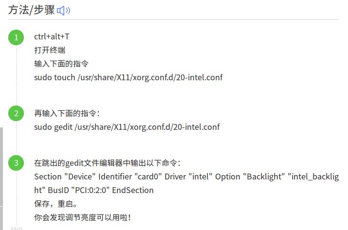 2、筆記本調節屏幕亮度的fn功能鍵無效,可以創建/usr/share/X11/xorg.conf.d/20-intel.conf文件并添加內容 Section "Device" Identifier "card0" Driver "intel" Option "Backlight" "intel_backlight" BusID "PCI:0:2:0" EndSection 然后保存重啟系統。