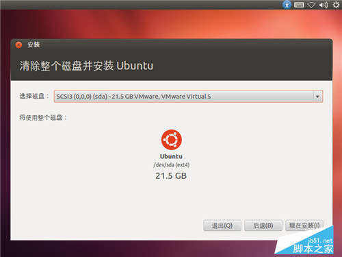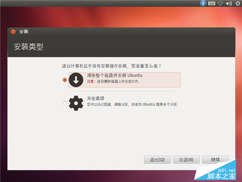 之后,由于我是直接在虛擬機上安裝Ubuntu,所以直接選擇清除整個磁盤并且安裝Ubuntu。
