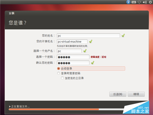 最后設置好登錄名與密碼,只要輸入完姓名,其它用戶名什么的自動補全。登錄就直接設定為“自動登錄”就可以了,不要這么復雜,但是,這個密碼還是要記住的。因為以后你通過Ctrl+Alt+T打開終端,執行某些命令,需要這個密碼。