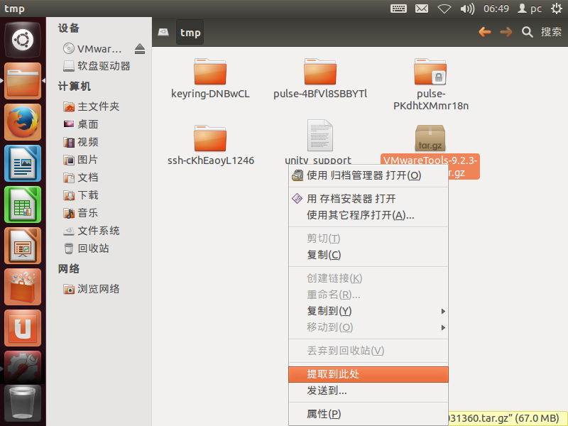 2、之后Ubuntu會(huì)彈出一個(gè)已經(jīng)加載好的光盤(pán)設(shè)備。直接對(duì)光盤(pán)中的tar.gz復(fù)制到/tmp,這個(gè)文件夾,裝完重啟后里面的內(nèi)容會(huì)消失,反正安裝文件留來(lái)也沒(méi)用了。