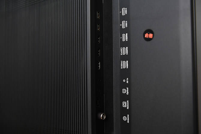 機(jī)身背部雖然在使用中看不到,但小米電視『大師』65”OLED的背部設(shè)計(jì)也非常簡潔,一體性很高。接口方面的設(shè)計(jì)其實(shí)也是非常有學(xué)問的。最常用、最常插拔的USB2.0和HDMI接口全部布局在機(jī)身側(cè)面,方便用戶播放本地影片、連接顯示輸入設(shè)備。