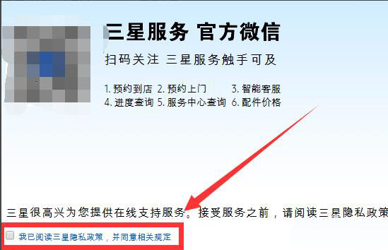3、三星智能服務界面,勾選左下方同意協議。