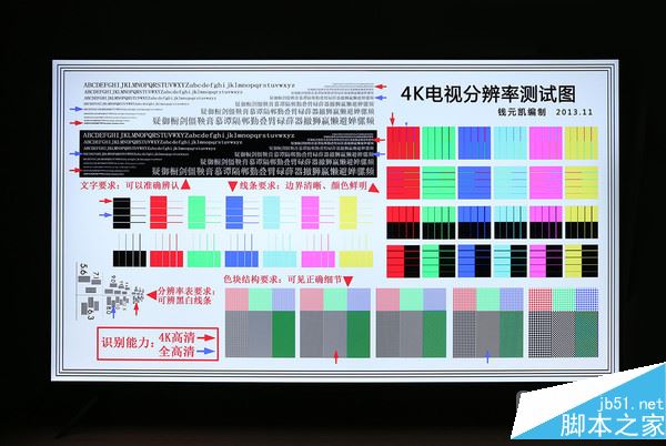 小編首先使用錢元凱教授繪制的4K分辨率測試圖進(jìn)行測試,在4K電視分辨率測試圖中,可以準(zhǔn)確辨認(rèn)出文字,大字體邊緣銳利,小字體絲毫不糊。色彩線條邊界清晰、顏色鮮明,色彩之間涇渭分明。圖片上的分辨率表,即使是最小的黑白線條,都可以清晰分辨,色塊結(jié)構(gòu)更不用多說,可以看到正確細(xì)節(jié)。