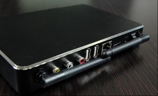 全黑色金屬機身,酷似路由器的兩根外接天線,看起來沉穩大氣。開博爾這款盒子接口齊全,有網線接口、三色AV線接口、USB接口等等。