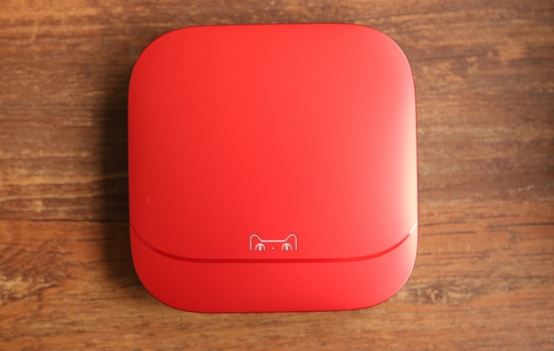 天貓魔盒3Pro的正面非常顯眼,機身正面采用大紅配色,在其下方四分之一處有一抹鮮明的帶狀條紋,上面是天貓小喵臉logo。盒子底部并沒有采用常見的四腳墊設計,而是一圈閉環式的塑料凸起用來穩固機身。