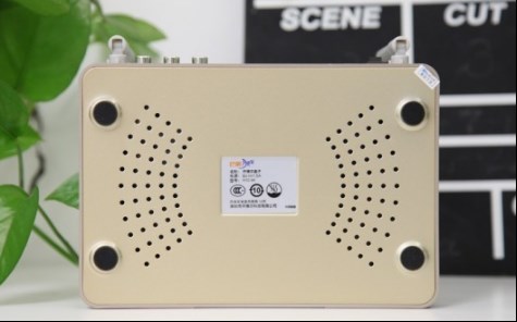 開博爾盒子H10金屬底板中央貼有產(chǎn)品銘牌,并且大面積分布有扇形散熱孔,四角配備膠質(zhì)腳釘,除了可以防止盒子滑動,腳釘還與桌面形成一散熱空間,有利于機器散熱。