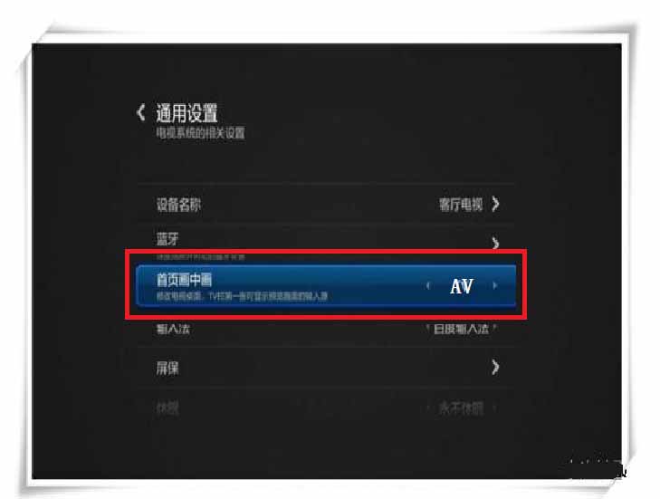 3、接著選擇“通用設置”——選擇“首頁畫中畫”——然后選擇AV輸入源,這樣開機就會自動進入廣電AV源了。