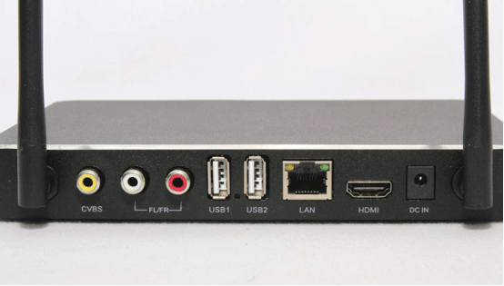 這款機頂盒提供了兩個標準USB插槽,還可以支持老的色差分量輸出。除了兩邊的WiFi天線外,也可直插有線以太網,由于沒有設計電源按鈕,插上電源之后就會自動開機。