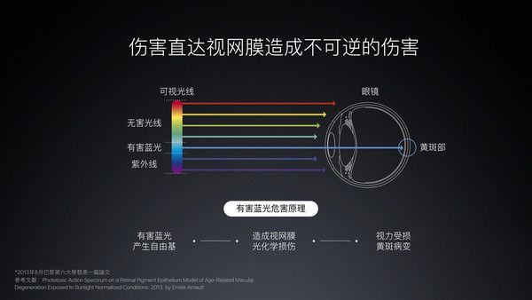 開篇就介紹了目前我國中小學(xué)生眼睛健康的一個堪憂現(xiàn)狀,其罪魁禍?zhǔn)撞贿^只是與我們形影不離的各種屏幕,所釋放出的高能短波藍(lán)光。縱觀目前市面上的防藍(lán)光技術(shù),諸如防藍(lán)光貼膜、防藍(lán)光護(hù)眼模式,都是利用外力攔截藍(lán)光,本質(zhì)上并沒有減少有害藍(lán)光的產(chǎn)生,還會造成畫面失真、偏黃,長期觀看不但起不到護(hù)眼的效果,反而會增加眼睛負(fù)擔(dān)。