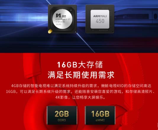 硬件配置可以說是智能電視的大腦,微鯨電視49D搭載了64位核心處理器,具備2G內(nèi)存以及16G的超大運(yùn)存,這樣的運(yùn)存配置可以說是在同級(jí)競(jìng)品中是頂尖的存在了。