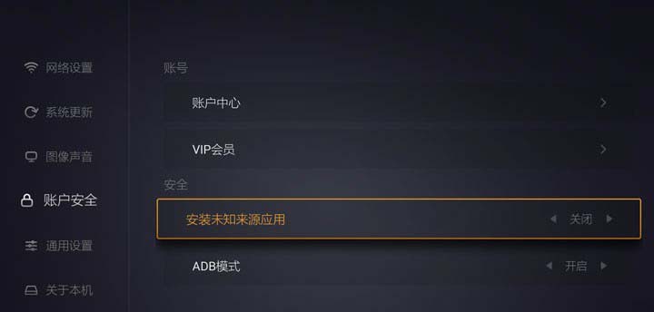 3、找打設置模塊以后,按下遙控器的OK鍵進入設置頁面當中,并且移動焦點停留在賬戶與安全,再向右移動焦點到安裝未知來源應用,把狀態修改為開啟。