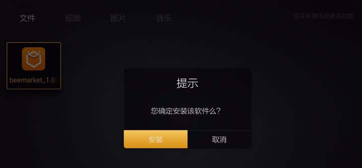9、焦點在安裝文件上時,按下遙控器OK鍵開始安裝之旅。這時候系統會彈出一個安裝的彈出窗口界面,選擇安裝即可。