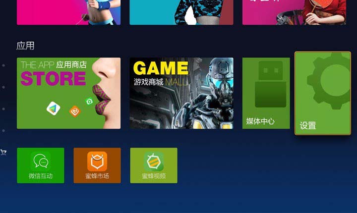2、盒子連接好以后通電開機進入系統的首頁界面,并且遙控器方向鍵向下滑動焦點在應用中找到設置模塊。
