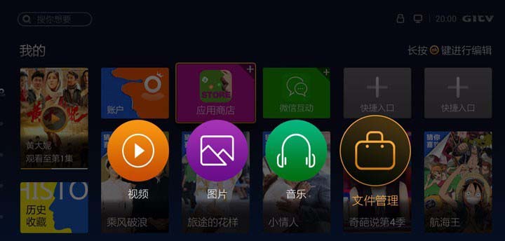 6、將準備好安裝文件的優盤接入盒子的USB接口當中,然后等待盒子彈出相應的界面后,選擇文件管理并用遙控器將焦點移動在該模塊上。