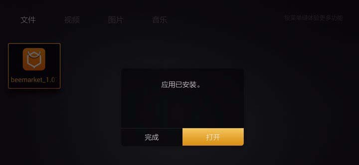11、應用安裝完成呢過以后,盒子會彈窗提示應用安裝完成。到此點擊完成結束應用安裝,點擊打開則可以開始使用應用了。