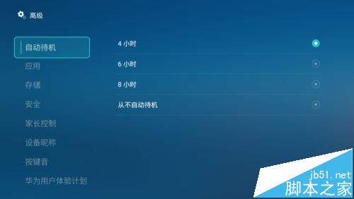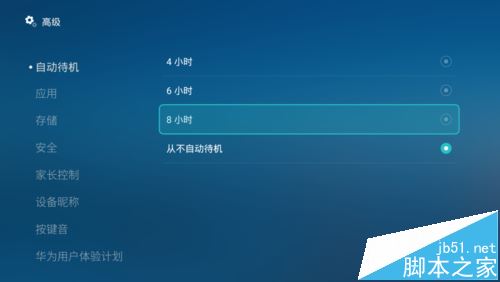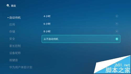 3、高級設置里面第一個選項就是自動待機,右邊則是進入自動待機的時長,有4/6/8小時,和從不自動待機,意思分別是盒子無遙控操作,無播放時4/6/8小時候盒子將待機。如果選擇從不自動待機的話,意識無論如何盒子都不會進入待機模式。
