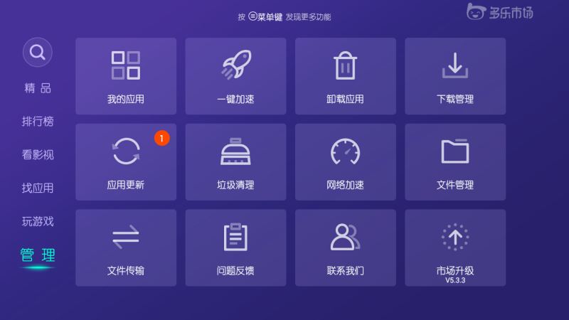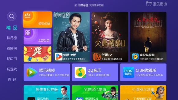 多樂市場是一款Android系統智能電視及電視盒子的APP下載平臺。為您提供海量的視頻、直播、音樂、游戲、工具、教育等APP資源,通過它輕松實現下載、安裝和資源管理,讓您的電視好看更好玩!