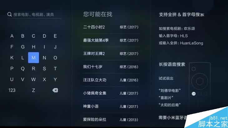 這個搜索界面大家都不陌生,如果在智能電視上進行精確搜找想看的內容,需要使用遙控器逐個字母輸入,即使支持首字母模糊搜索,輸入過程也不是那么順利,一不小心輸錯了還需要按刪除鍵,其實通過語音搜索可以很方便的解決問題,而且基本不用受年齡的限制,老人、孩子一教就會。