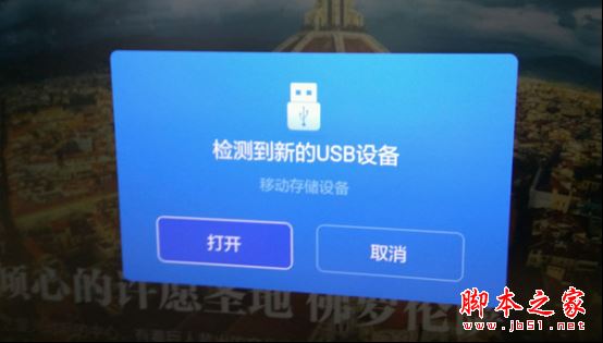 2、以泰捷視頻為例,把它的安裝文件復制到U盤,插入小米盒子USB插口,這時會看到自動彈窗,點擊“打開”: