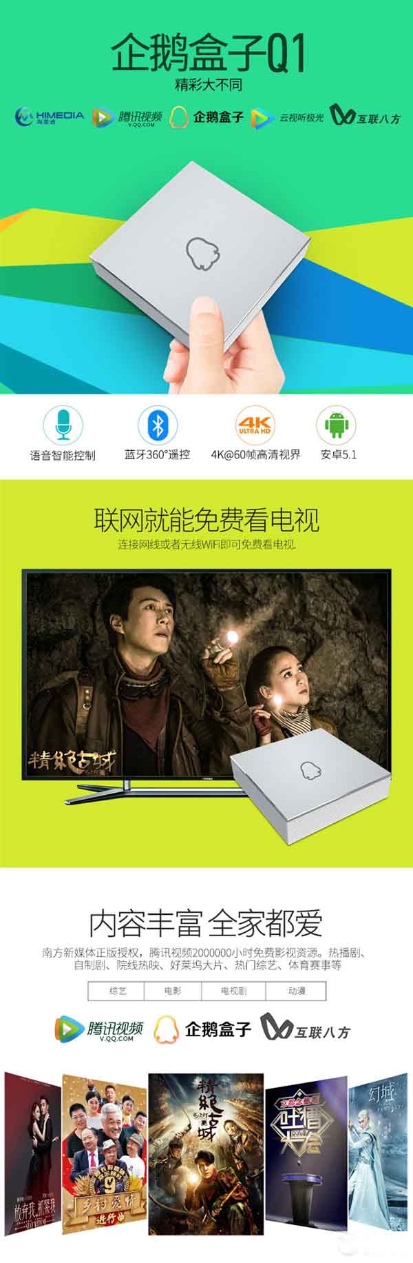 日前,騰訊視頻聯合南方新媒體推出首款定制版網絡電視機頂盒“企鵝盒子Q1”,其售價為288元,目前已經在京東商城預售。