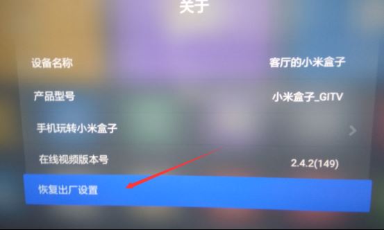 2、選中“關于”按鈕,然后可以看到恢復出廠設置的選項,點擊即可恢復出場設置,可以有效地解決升級失敗問題: