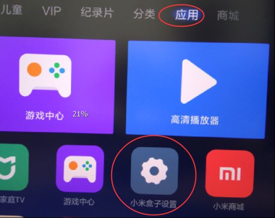 1、在小米盒子的系統首頁,選中“應用”,并點擊首頁的“小米盒子設置”: