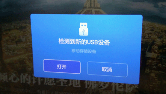2把U盤插入到小米盒子的USB接口,看到彈窗之后,選擇“打開”選項(xiàng):