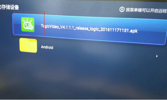 3、打開之后,點擊自己的U盤,并選中安裝文件,按遙控器確認鍵進行安裝: