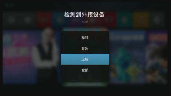 2、把最新的安裝文件轉(zhuǎn)移到U盤,然后插入天貓魔盒的USB插口,這時(shí)魔盒的界面會(huì)自動(dòng)彈出窗口,選擇“應(yīng)用”即可: