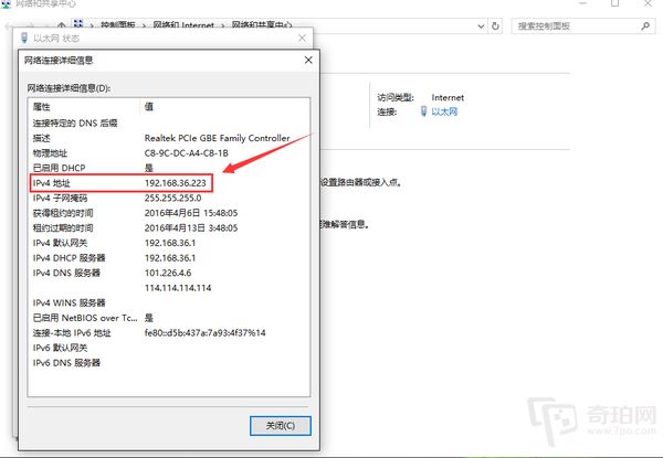 3、打開電腦的“控制面板”,選擇“網絡和共享中心”,點擊“以太網”,查看“詳細信息”,找到IPv4地址(連接小盒子的關鍵)!