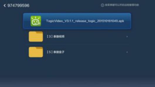 2、用遙控器點開后續頁面,找到泰捷視頻安裝文件,按遙控器確認鍵進行安裝: