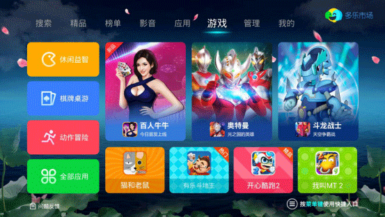 軟件數(shù)量最多、更新速度最迅速的電視應(yīng)用市場(chǎng),設(shè)置了多道審核程序,保證軟件綠色、健康,是眾多熱門(mén)軟件、大型游戲的首發(fā)地。