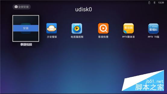 如果說系統沒有自動檢測到U盤,小編還有一妙計可解決該問題,請打開主界面的“應用”,點擊“多媒體播放”,找到你的U盤設備,點開之后,就能發現下載好的泰捷視頻安裝文件,點擊安裝即可(如下圖):
